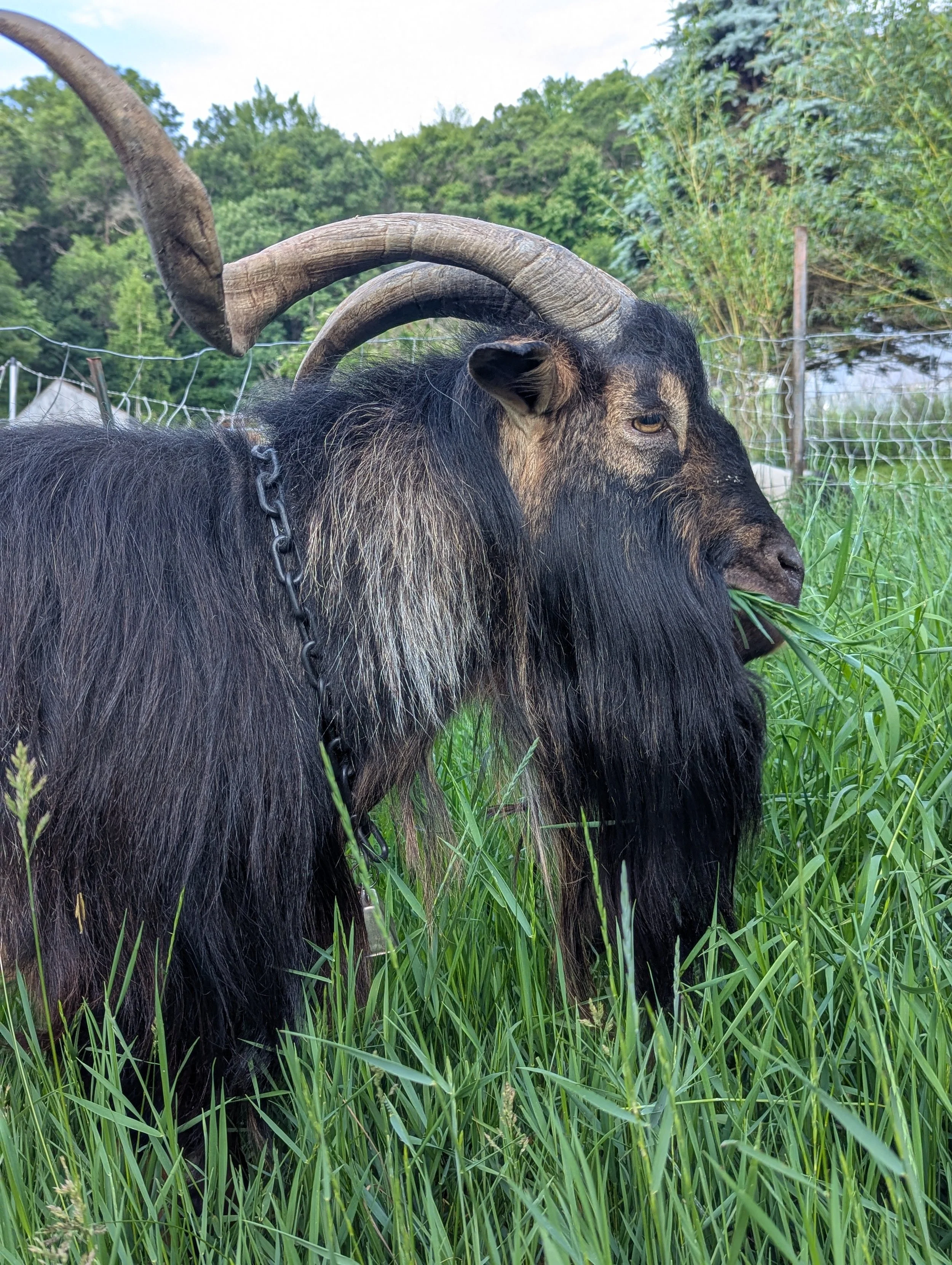 Luigi shows off his impressively long tail hairs. It leaves some of the other goats envious.